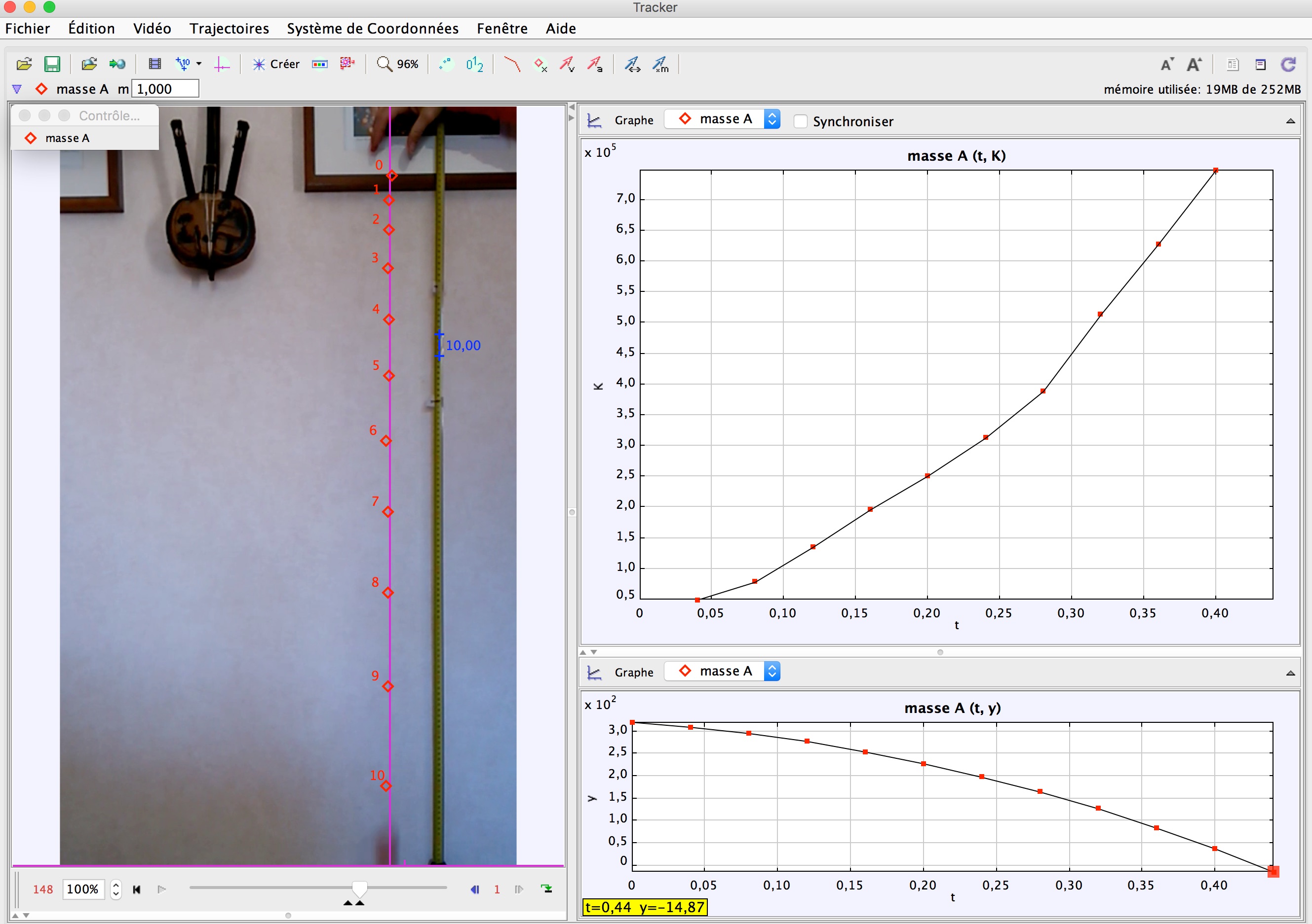 Des logiciels comme Tracker ou Aviméca permettent de suivre un point particulier d’un objet en mouvement depuis une vidéo de celui-ci (capturée par un smartphone par exemple). Si l’on a pris soin de placer un repère de taille sur la vidéo au moment de la prise de vue, le logiciel enregistre alors (de façon automatique pour Tracker) la position de l’objet sur toutes les images de la vidéo. A l’aide d’un repère placé par l’utilisateur, on obtient alors immédiatement la trajectoire, la vitesse, l’accélération et même l’énergie cinétique d’un objet au cours de sa chute.