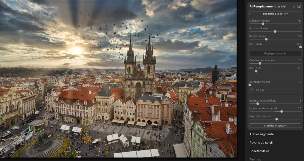 À l’aide d’un traitement par algorithme automatique, on peut demander au logiciel, en quelques clics de souris, de remplacer le ciel, d’y placer des oiseaux et de rajouter des effets atmosphériques :